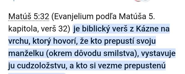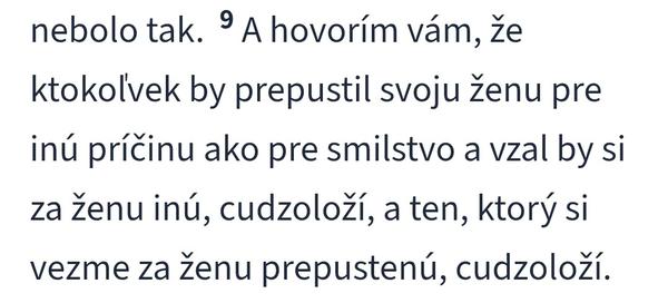 @pedro1234 pohľadaj si čo hovoril Ježiš o rozvode Evanjelium podľa Matúša 5:32 a 19:9 kedy je prípustný dôvod na rozvod