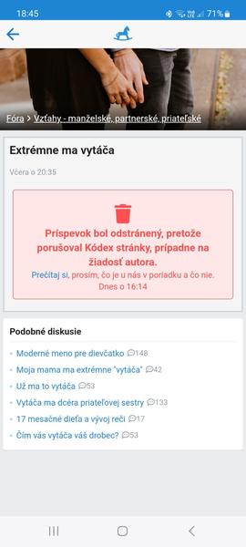 Tak začalo to údajne extrémne pre motivovanou matkou,ktorej dieťa kyvalo inému dieťaťu ktore mu ale neodkyvalo a ona bola "extrémne vytocena" ze matka toho iného dieťaťa mu nepovedala, aby odkyvalo. To sa riešilo na asi 10 stranách a potom "matka" začala opisovať, ako si to rozdali s mužom na WC v obchodnom centre, zatiaľ čo to ich "veľmi kontaktné dieťa" sedelo v kočíku v nejakej vedľajšej miestnosti 🙈🙈(asi preto bola aj zmazana)