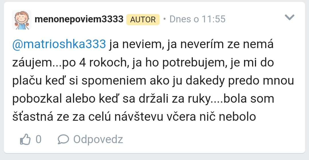 Podľa mňa tu už nič nenapíše, lebo sme jej dali veľa komentov a jej docvaklo, že sú to vlastne náznaky, že ju všetky milujeme a teraz nevie, ktorú z nás si má vybrať a tak pre istotu neodpíše ani jednej 😅