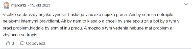 Sme spolu už takmer pol roka, z toho v súlade s korporátnymi pravidlami asi mesiac, zamestnávateľ vie, vyvíja sa to dobre a aj keď pár detailov je ešte potrebné doriešiť nič nenasvedčuje tomu že by ktokoľvek z nás bol nútený meniť prácu.