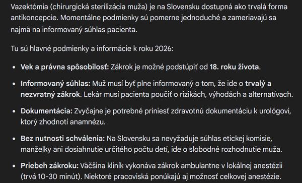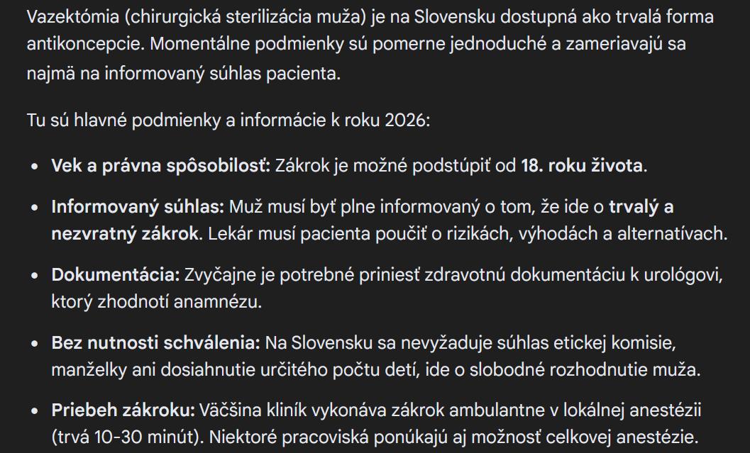 @cacianka áno viem .Aj tak nedokážem pochopiť ,ako mu slobodnému a mladému chlapovy ,urobili vazektómiu.Keď som sa na zákrok, pred 15 rokmi informoval,bolo mi povedané ...vek po 40ke a 2 deti ...čo som spľňal a dokonca v tlačive bola kolónka ,kde manželka svojim podpisom dala ...súhlas so zákrokom.To bolo v Trenčíne na Urológii.