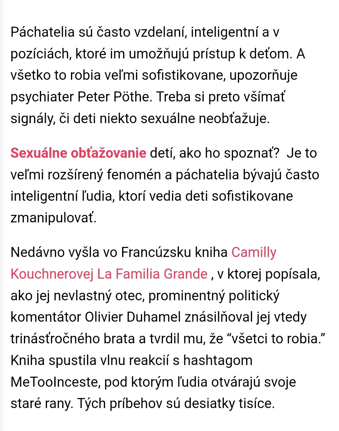@zuza265 to je jedna rovina teba, co si to zazila. Mrzi ma to velmi. Dalsia rovina su tie nespocentne zneuzitia ktore aj dospele zeny, alebo teda deti-ich rodina neoznamia. A kolko by mohlo byt deti/zien od toho usetrenych, keby to niekto bol povedal. A mozno aj ty. Vlastne preco ho stale kryjes?