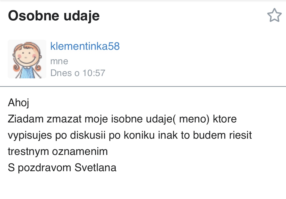Ale 2x mesacne zakladat o mne temy hadzat inicialy o mojich detoch, mne, zamestnavatelovi rok a pol uz je dost psycho.to ze sa vysmievaju z mojho vyzoru ma nerozculi lebo je to ich subjektivny nazor, ktory sa nemusi zakladat na pravde. Ale pisat inicialy a 2x mesacne ma tu kybersikanovat je uz moc. Cakala som ze ho to prejde ak budem ignorovat diskusie nepomohlo, ocividne nepomohlo ani zrusenie uctu. Raz ho zastavim. Som v kontakte aj s nadaciou v boji proti sikane maju celkom sikovnych pravnikov