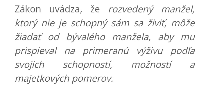@maciatkolulu vnímaš ten rozdiel? V prípade manželov ide o rovnakú úroveň života a v prípade exmanželov iba v prípade, že sa z objektívnych dôvodov nevie o seba postarať. To je obrovský rozdiel. Preto jej píšem, že ak sa manžel nechce rozvádzať, tak nech platí. Lebo on sa nechce rozvádzať a ona zatiaľ nevie zarobiť.