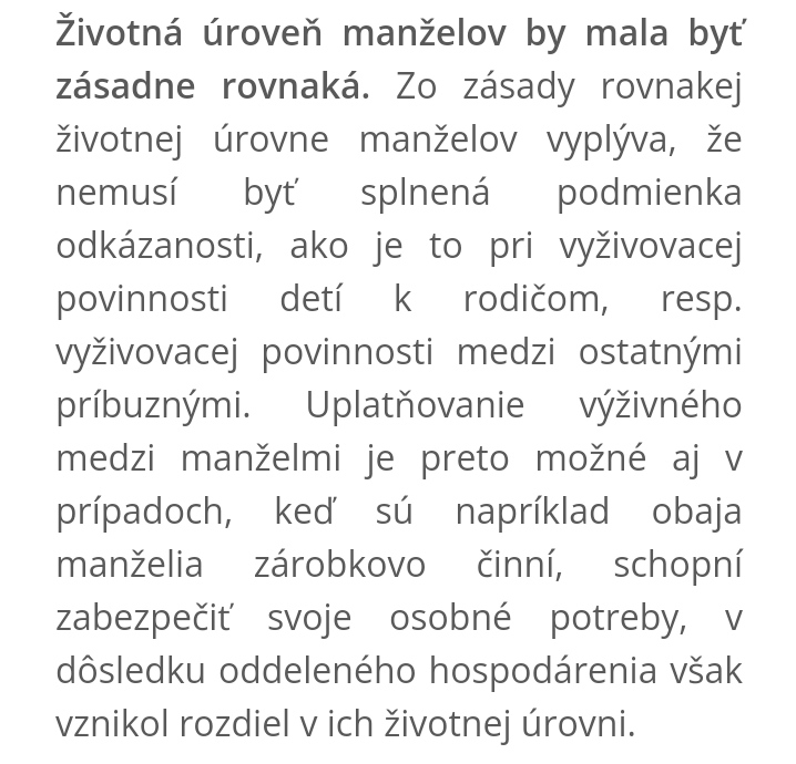 @maciatkolulu ty vieš čítať s porozumením? Kým sú manželia majú nárok na rovnakú úroveň života. Aj keď sú obaja sami zárobkovo činní, len vznikol rozdiel v ich životnej úrovni.