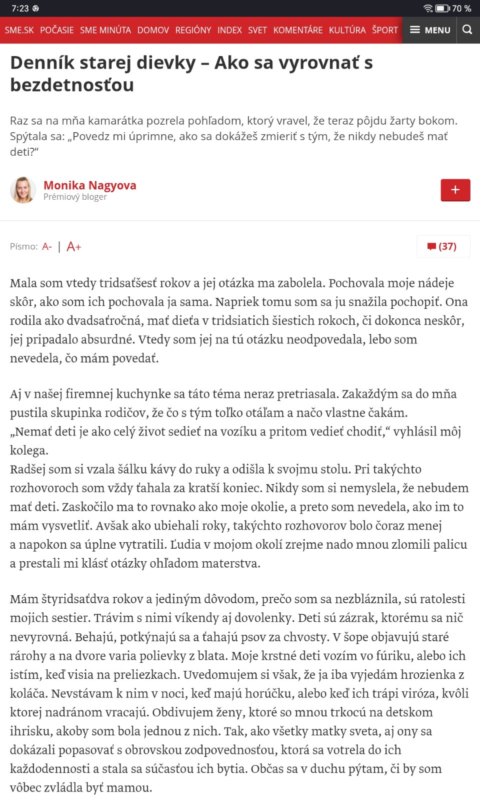 No baby, presne toho, čoho som sa celý život bála sa stalo realitou. Stala sa zo mňa stará, frustrovaná stará dievka. A to som mala veľmi dobre našliapnuté v mladosti, ale život sa vyvinul napokon inak. Nejdem sa tu sťažovať na svoj život a vylievať si srdce, idem po radu, ako sa switchnúť späť do nejakého rozumného módu. Necítim sa komfortne v tomto nastavení a to nechcem. Tú frustrácu a nejaký vnútorný hnev potrebujem odstrániť a celkovo sa nastaviť inak. Keď mi viete poradiť nejakú knihu alebo film, budem rada. Lebo aj sama sebe už leziem na nervy. Ďakujem.