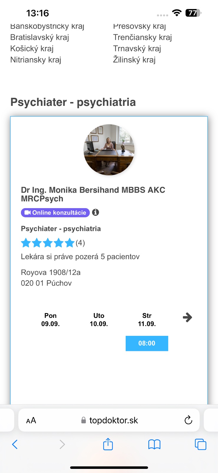 Dnes som obvolal ďalších 5 psychiatrov, všetci ma odmietli, že neberú mimo okres. Ja sa proste NEVIEM dostať k psychiatrovi v okolí 50km. Posledný telefonát ma dorazil. Začal som rozprávať, že mam ťažkú formu úzkosti a tá pani ma odporučila na psychoterapie, že samotné antidepresíva riešia tak LEN 10% (!!!) problému. Ako ja už pár sedení u psychológa mám, ale ako mi v dohľadnej dobe pomôže ten psychológ, keď ja chodím na WC 10x denne ? A mám bolesti po chrbte. Nespávam. V noci sa cítim ako keby ma šiel niekto nožom zarezať... Ja normálne začínam panikáriť, že som fakt už nadchádza môj čas. ☹