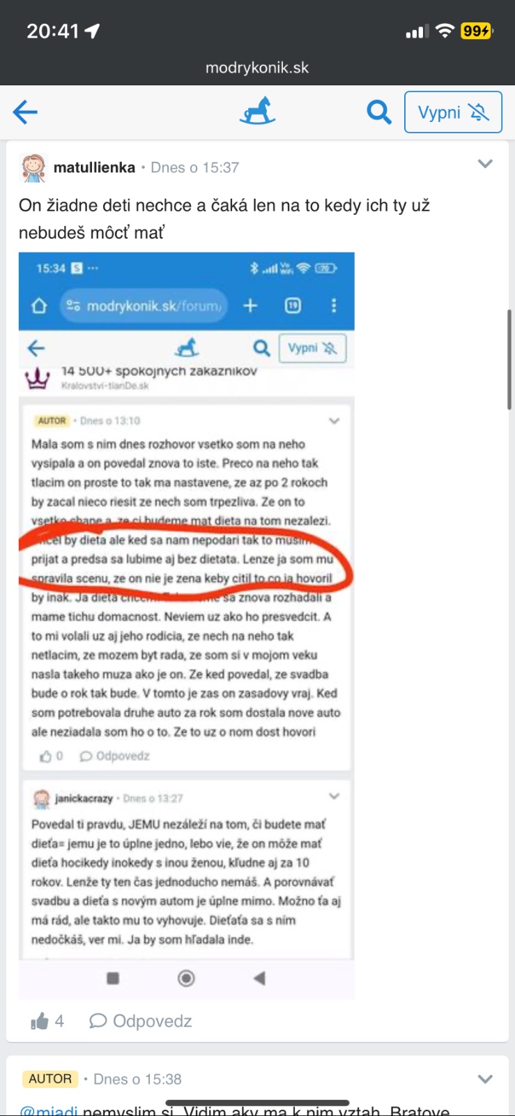 Tu ked citam temy.. mm mà svoje muchy ale vzdy sa najdu veci kde ho ocenim ze toto mi nikdy neurobil . Nikdy sa nestazoval rodicom . Nikdy sme rodicov netahali do nasich problemov ak sme nejake mali riesili sme ich doma medzi sebou . Taka sms od potencialnych svokrovcou by sa mà dost dotkla. Ale Hlavne ze on sa na mna stazuje .. v takejto veci intimnej. To je len dalsi dokaz ze dieta nechce . Vyhovujes mu na dom byvanie. Asi dobre varis upratujes ., na ten dom ta potreboval. A teraz staci par rokov odsuvat dieta a zachvilku sa to vyriesi same ze ziadne dieta nebude Lebo uz bude neskoro. Nie je on v kute mà ta tan kde chcel. Ty sa snim nerozides a casom na to dieta zabudnes zmieris sa . Kupite si psa .