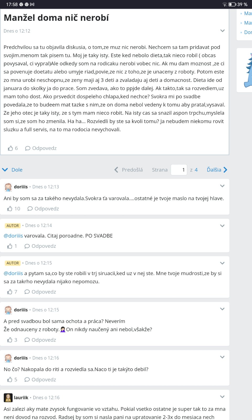 Ide o to, ze s detmi uz nezvladam chod domacnosti, obcas by som prijala jeho pomoc (ano, na zaciatku som to nejako nevyzadovala, on riesil veci okolo domu). Lenze teraz nerobi okolo domu nic, obcas pokosi travu a ja mam toho denne kvantum. Mame este dve male deti, tym sa snazim plne venovat. Dneska rano som sa uz rozplakala pri pohlade na kuchynu (kopa riadu, bordel na zemi atd), a on ma ignoroval (to robi furt, ked nieco ziadam). Tak sa ho pytam, ze ci ma uz nelubi, na to on vystekol, ze preco by ma nelubil?? A ja ze ked vidi, ze je toho obcas na mna moc, tak by mi kusok pomohol…nato vystekol, ze on tu nebude robit vsetko a ze vecer som nemala kukat do mobilu a spratat si to. To uz som chytila uplny zachvat placu, ze mi vycita, ze este vecer, ked konecne deti spia, ja si konecne sadnem a trocha zrelaxujem. Pritom on tu naozaj nerobi nic, nic! Aj ked som bola vcera vecer cvicit (konecne som si to vydobila), tak bol 2h s detmi a oni boli na telke a on na mobile.(mohol aspon vylozit mycku).
