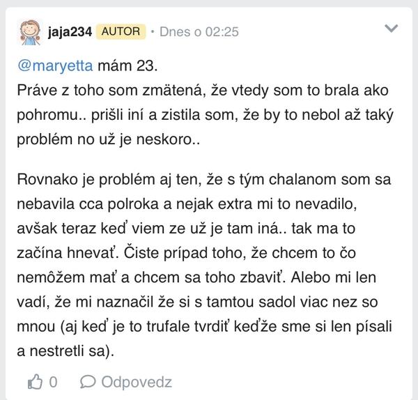 Po čase som sa ozvala chalanovi, s ktorým som si prestala písať kvôli veci co mi na nom vadila. Avšak prišla som po čase na to, že to nie je pre mna az taka zasadna vec (moja spekulacia), tak som sa mu ozvala a prisla na to ze už rieši inú.. tak ma to vzalo.