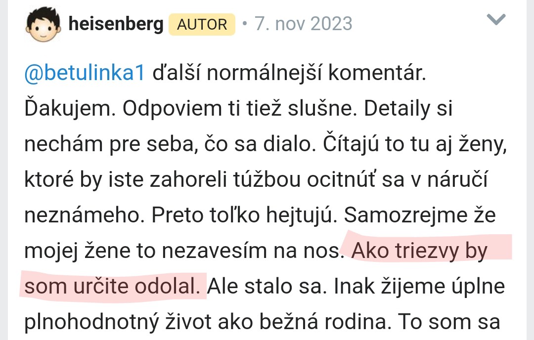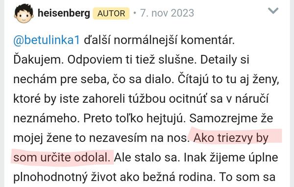 @kikusha2212 tak ešte som to tu možno nespomenul, ale ja svoju ženu úprimne ľúbim. Máme spolu pekný vzťah. Aj keď hneď sa toho niekto chytí ako dobrého motivu😉Do podrobna z pochopiteľných dôvodov nepôjdem. Koho by to aj zaujímalo. Takže žiadne city neochladli voči nej. To "Ja" som môj problém, nie ona. Jej dávna nevera s tým nemala vôbec nič spoločné, ako to niektorí písali, že som sa chcel pomstiť.