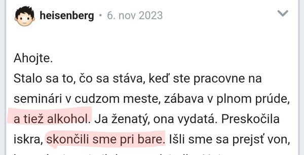 Stalo sa to, čo sa stáva, keď ste pracovne na seminári v cudzom meste, zábava v plnom prúde, a tiež alkohol. Ja ženatý, ona vydatá. Preskočila iskra, skončili sme pri bare. Išli sme sa prejsť von, hovorí mi, vraj nikdy nepodviedla. Najprv som nechápal, ale potom mi to došlo, kam toto celé smeruje. Boli sme ako v tranze. Detaily preskočím až do doby, keď odchádzala z mojej izby. Budete ma tu kameňovať, aký som hajzel a podobne, ale pravda je, že to neľutujem. Znova som zažil ten pocit života, to čo som už dlho nezažil ako prvé neskúsené bozky vonku v parku, keď vám svet okolo pripadal tak krásny. Život väčšiny z nás, ktorí žijú roky v monotónom kolobehu práce, rodiny a dookola, kým vám váš život nezovšednie, tajne dúfajú v tú iskru, ktorá vo vás znova zapáli tie emócie, ktoré rokmy otupeli. Milujem svoju ženu a rodinu, takže nič sa voči nim u mňa nezmení. Možno ma pochopia tí, čo si tým podobne prešli. Čo si o tom celom myslíte?