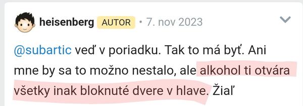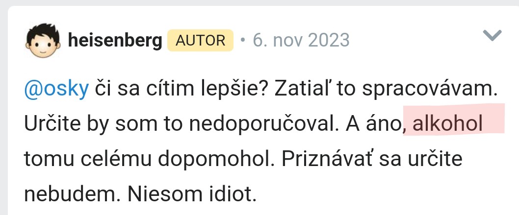 @heisenberg Jáj, prepáč, ja som to zle prečítala. Ja som si myslela, že si mal vypité. A pritom ty si bol úplne triezvy! 😅