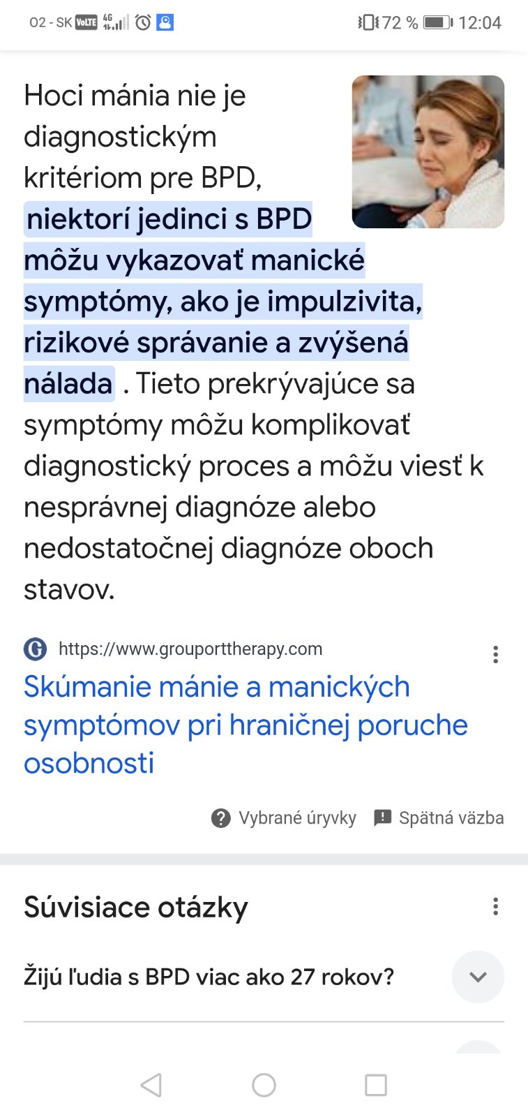 @jamimo tak ja neviem čo mám, ale je mi zle. Teraz som mala asi 3 týždne také, že som sa ledva postarala o syna, proste som bola bez energie. Ja nie som vôbec agresívna ani výbušna. Zvýšila som si Escithil čo beriem na depresiu. No a až v tom stave som si uvedomila moju promiskuitu. No dovtedy sa mi v priebehu dňa menili stavy smútku s divnymi stavmi radosti. Neviem sa dobre sústrediť a mam strašne zlu pamäť.