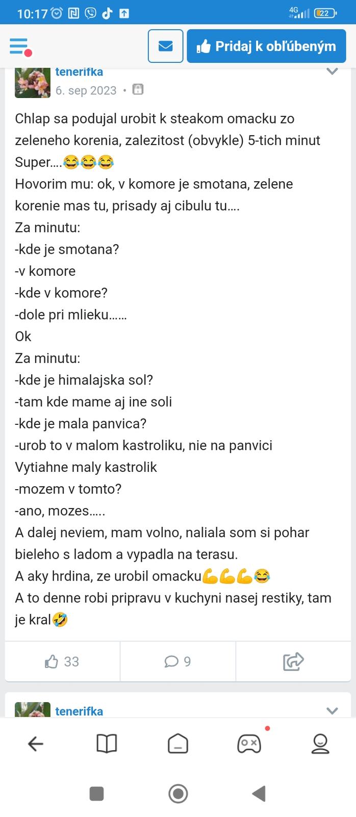@ondro1122 Ale no tak, to snáď preháňaš. Keď anonymná žena bez fotky napíše na verejné fórum úsmevnú príhodu zo života, tak "verejne zosmiešnila svojho muža"? Konkrétne tá, ktorú si sem dal, ani nežije na Slovensku a jej muž je cudzinec, žiadna z nás ho nepozná.