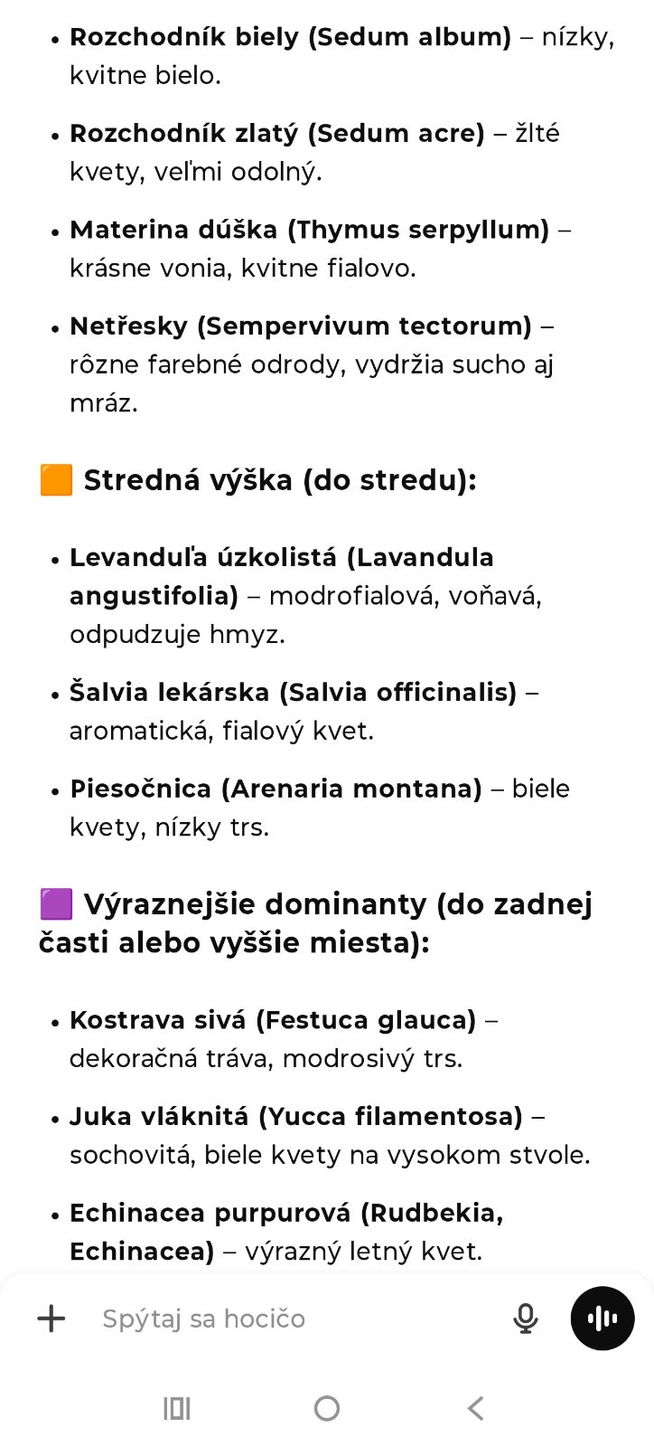 Rozchodnikov mas mnoho druhv a odrd, kazdy sa hodi. Niektore su nizke, su aj pol metra vysoke. Salvie mas vicereo odrod, roznych odtienov od ruzovej az po syto fialovu. Skalne ruzi je tez vela odrod, kazda vyzera inac. Levendule vyberaj opatrne, pretoze niektore su velmi roztahovacne a za par rokov ti zaberu cely zahon.Vyberak skor mensie druhy a levandulu lekarsku, francuzska levandula u nas vymrza Echnacea ma tiez mnoho odrod, treba si vybrat take, ktore sa ti pacia. Ostatne su v pohode. Okrem toho mas vela skalniciek, ktore kvitnu na jar, niektore uprostred leta a niektore na jesen. Treba nakombinovat tak aby stale nieco kvitlo. Ako zaklad moze byt to co ti robot ponukol, ale treba si nastudovat viac, budes to mat pestrejsie