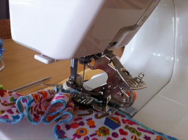 A konečně jsem se jakž takž sžila s řasící patkou, sice to chtělo vychytat nastavení a měla jsem sto chutí to vyhodit z okna, ale třeba ten kanýrek na šaty mi nařasila krásně a rychle a rovnoměrně! Oproti řasení na OL to má výhodu, že to řasení nemusí být jen u kraje a taky se dají dělat rozestupy a větší sklady (je to např. na tašce, ale dole jsem to musela dorovnat ručně a je to vidět, protože ta patka řaší jen jednu stranu).