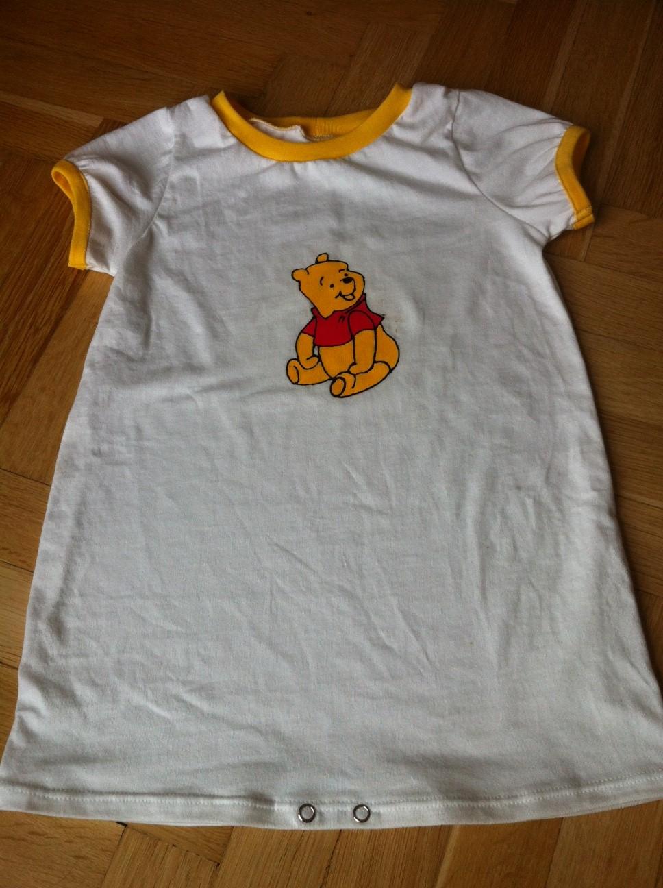 noční košilka se osvědčila, tak jsem vytvořila další. Je na ní medvídek Pú a předlohu pro něj vytvořila moje babička, ale náhodou to zrovna tou dobou stejně namaloval i jakýsi Disney. No ale mohli by mi ti jeho kumpáni teda něco o pajcování říct, medvídek je podle babičky a basta, to je přece normální, že ve stejnou dobu můžou dva různí lidi namalovat némlich to samé 😀 😀 😀 😀 😀