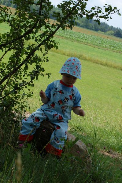 2) houbbičkové pláťáky, ty už má ale z loňska stejně jako ten klobouček, kalhoty jsou s ohrnovacím lemem, takže letos je nosí bez zahnutí no a nové triko s velurovou nažehlovajdou, ale to už jsem tady ukazovala, ale jenom na ramínku