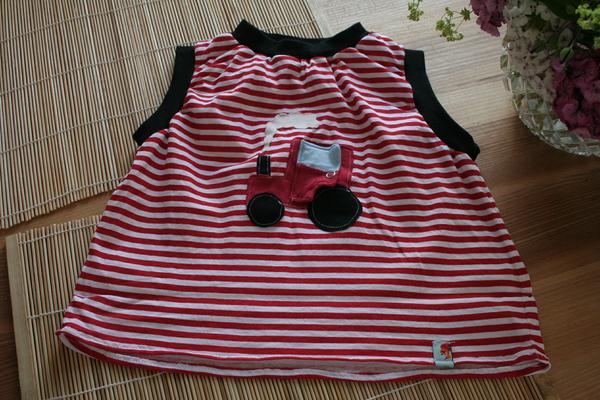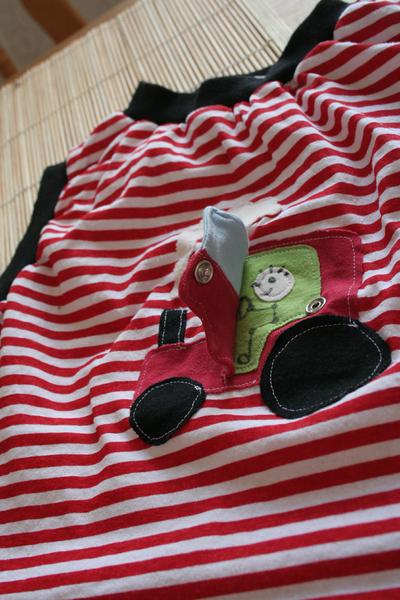 Autíčko od lenass mě taky nakoplo k něčemu podobnýmu, a tak má Toník traktor 🙂 Řidiče jsem nakreslila fixem na textil. Ale strih se mi nechtelo obkreslovat, obkreslení trika se ale nepovedlo a celý je to takový nanicovatý...