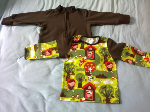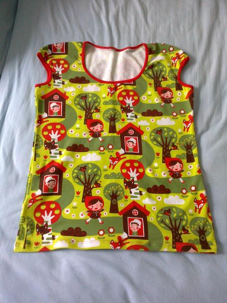 Odladila jsem střih na hrozně příjemné tríčo s krátkým rukávem, tak jsem si jich našila několik, k tomu sukni z Mylly proužků. Kompletek pro prcka a nakonec karkulkový úlet pro mne.Jo a ještě šaty pro neteř.