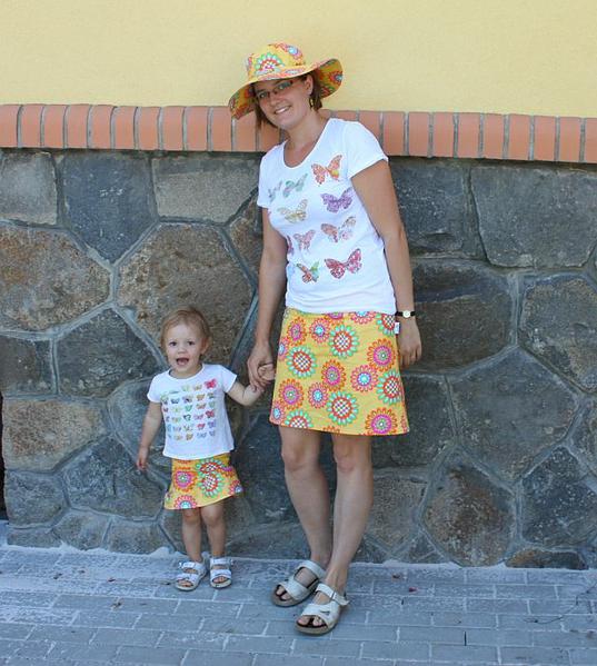 Posílám dnešní módu do kostela. Už to máme ušité déle, ale nenafotily jsme. Dorazil mě jeden kluk (pán? Je mu jako mě?🙂 - říká " vy máte s maminkou stejný trička .... a i trenýrky" .... 😀 😀 😀 😀 😀 Jako to fakt neumám ušít sukni, aby vypadala jako sukně nebo ten chlap byl úplně vožralej??? (včeře páně nebyla! ) 😀 😀 😀