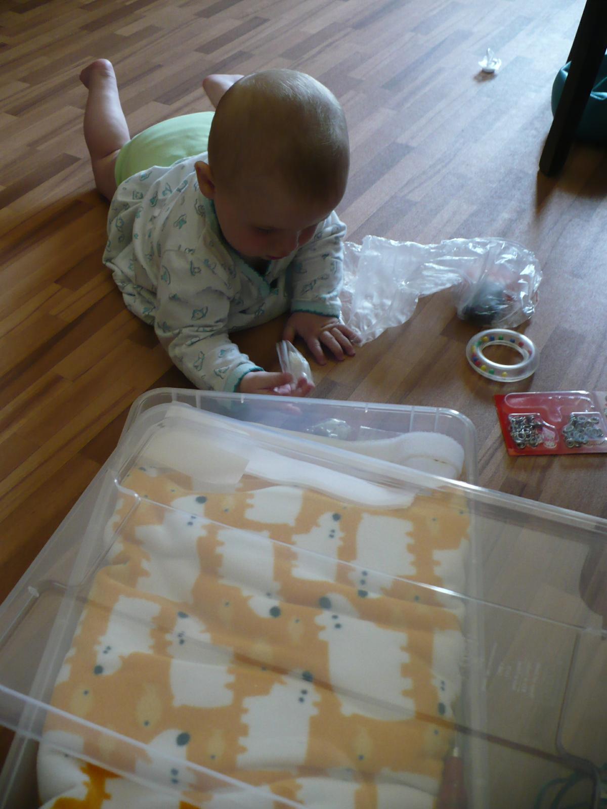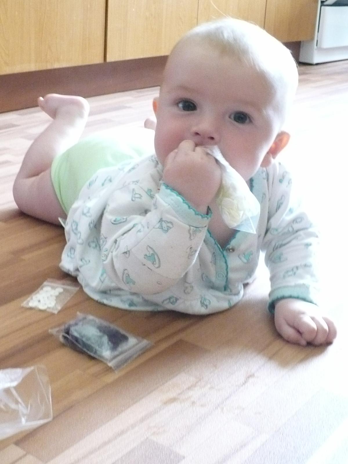 Ahoj holky, tak jsem v poslední době něco málo ušila (látkové pytlíky, jedny slintáky a ještě nějakou dorbnost) a tudíž jsem si povolila sem zas nakouknout. Nicméně dneska na vás myslím skoro celý den - Bášek se tu plazí, roztahuje mi pytlíčky s patentkama (ano, pořídila jsem si kleště), hází si je do nočníku, a pak do něj strká hlavu - máte to taky tak? A už taky zkoušel tahat za šlapadlo od stroje, který manžel nechal na zemi (ještě nejsme dost vycvičení, je to pár dnů, co se začal takhle aktivně plazit).