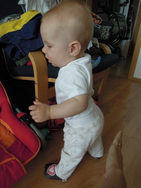 Jinak u nás se situace lehce zdramatizovala, Ela už padá míň a prozměnu se nám při příznivích podmínkách staví (to se vždy modlím aby si nenatloukla-naštěstí ze stoje zatím padá na zadek-nejhorší to je než se postaví). Zatím se staví stylem, doleze k malému křesílku, u něj se postaví do předklonu-narovná nohy a je jakoby v předklonu(ruce má nízko) a pak si přeručkuje na velké křeslo, které je hned vedle a tam už si normálně stojí a řechtá se.