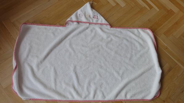 před dvěma dny mě napadlo, že by bylo hezké, kdyby mělo dítko na dovolenou ručníkové pončo, ale neměla jsem doma žádné froté, ani osušku, kterou bych chtěla rozstříhat. A hlavně ani se mi s tím moc nechtělo šít. A dneska jsem při skládání prádla dostala nápad, většinu práce za mě odvedl už někdo jiný 😀