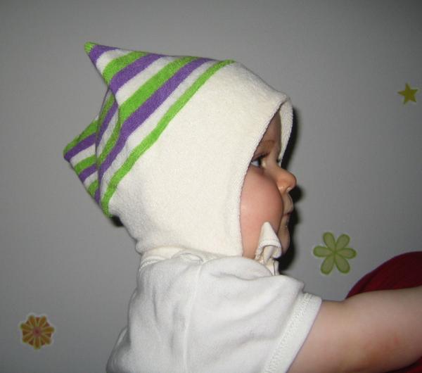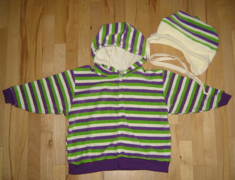 Jdu se i já konečně pochlubit se svými výtvory - komplet čepičky a kabátku a pyžamka - mikinky a polodupek. Doteď to moje tvoření bylo veřejně nepublikovatelné (tj. i nošení pouze na doma 🙂 ) Ale tentokrát si myslím, že s tím náš malý může i mezi lidi. Je to kombinace proužkovaného froté a patentu z Mylly a k tomu smetanové froté z Dadky. Čepičku jsem ještě nafotila na modelovi - má tři rohy. Tímto děkuji @daisyr, za trpělivost při mých požadavcích v hromádce. 😉