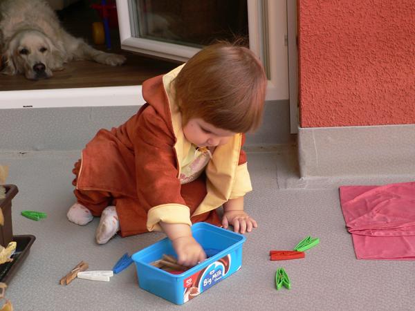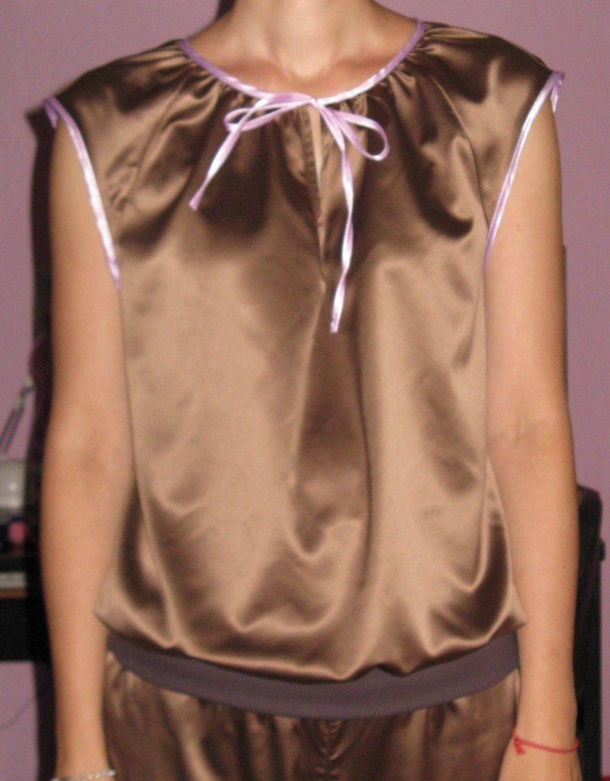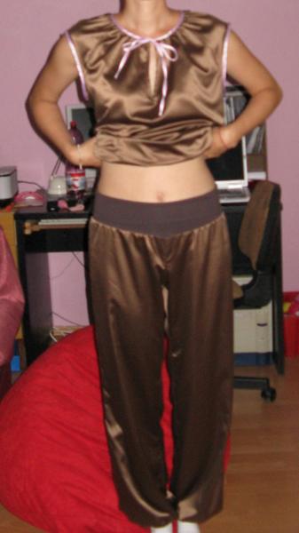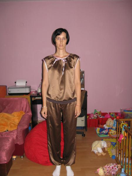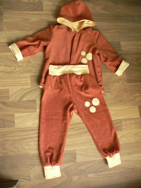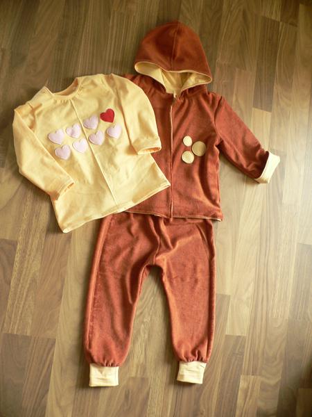 Jedna škoricová súprava z dadky (froté a jersey)...tu som maximálne uplatnila jedno slovenské porekadlo "šila - párala, leda nepostávala"....na nohaviciach som tie krúžky omylom našila na zadok, no nechcelo sa mi to prešívať, tak som to tak nechala. Niečo podobné sa mi podarilo aj na tričku, ale srdiečka na zadnom dieli, sa mi teda vobec nepozdávali. Potom som prišila opačne rukávy a furt sa mi cuckoval zospodu steh dvojihlou... som si pri tom proste užila. Ale mám rozšitú ešte jednu zeleno-ružovú súpravu...
