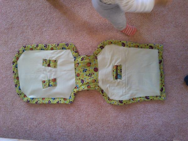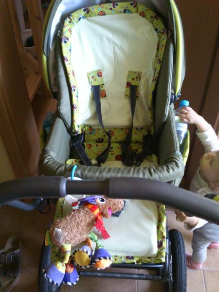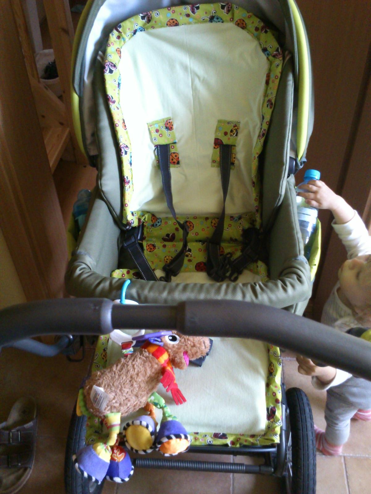 Došila jsem vložku do inglesiny.., myslela jsem, že u toho vyhodím i stroj, nejen výrobek 😀. Jsou to dvě vrstvy irmy, dadka jersey a berušky mráz.. To vypadá, že mám jen beruščí látku 😀, jen se mi k té zelené nic ostatního nehodilo 😅 . Doufám, že jsem tím nepřivolala počasí rovnou na fusak 😀. Omluvte kvalitu fotek, je to mobilem a navíc za věčné asistence slečny dcery 😀. Na kočárek je to chycený 2 šňůrkama z berušek (to není vidět 🙂 ). Chyb je tam hodně, ale i tak z toho mám radost 🙂
