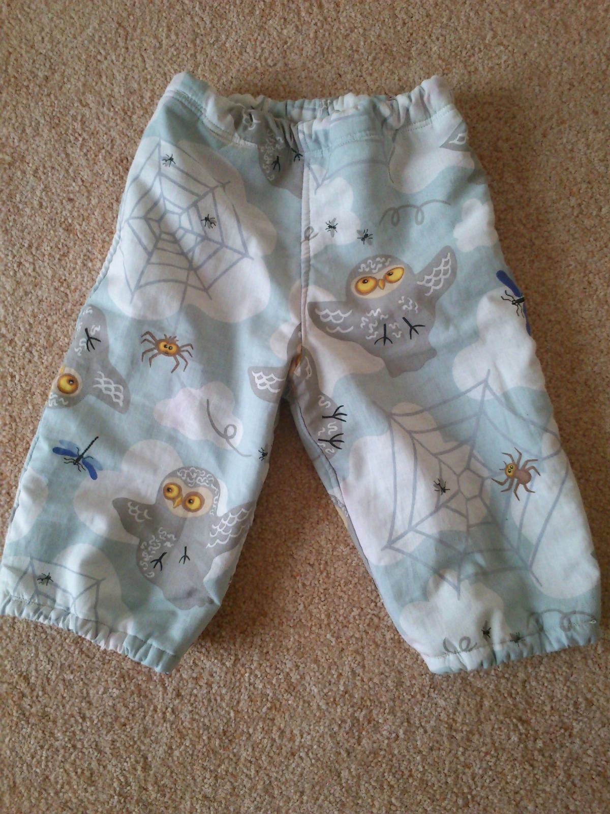 Včera jsem dodělala kalhoty/tepláky, jsou podšité flísem. Na modelce vypadají o poznání líp, ale vyfotit jí se moc nedá 😀, tak aspoň jen nudně na zemi 🙂. Původně tam měla být jiná bavlna, s menším vzorem, ale když jsem to šla stříhat, tak sovy volaly "vezmi si náááááás, hůůůů hůůůů" 🙂. Oproti vašim krásným věcem je to nesrovnatelné 😅 , snad to bude příště zas o něco lepší 🙂