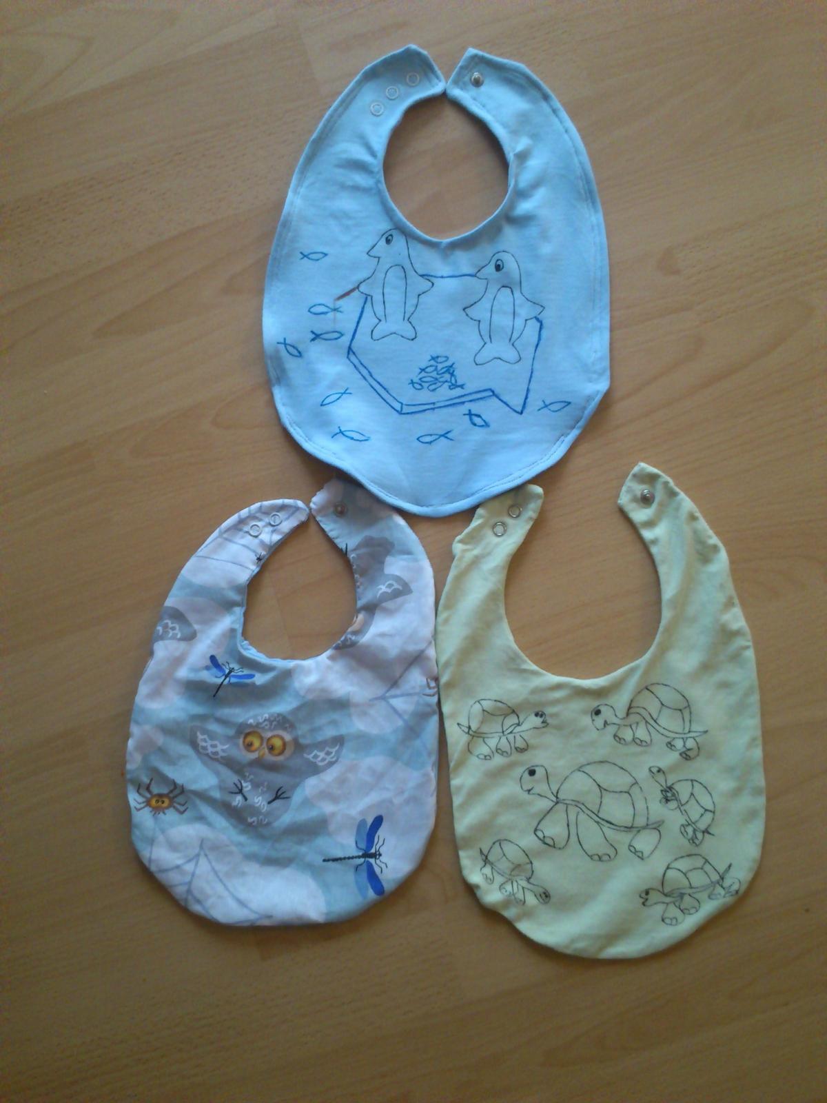 Přidávám pár bryndáčků.., nic extra, ale mám z nich radost.. 🙂. Soví látka je stejná jako na kalhoty z minulého týdne a tučňáci a želvy jsou moje umělecká tvorba, snad jsou v tom ta zvízata aspoň trochu vidět 😀). M. si je pořád motá kolem krku (nevím po kom, ale má trochu sebevražedné škrtičské sklony 😀).