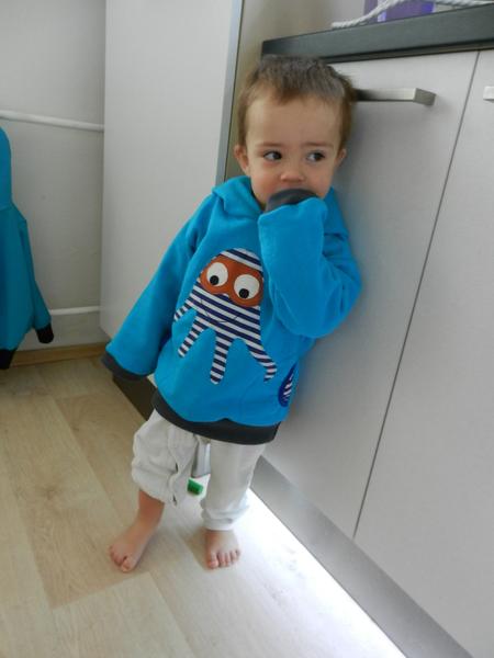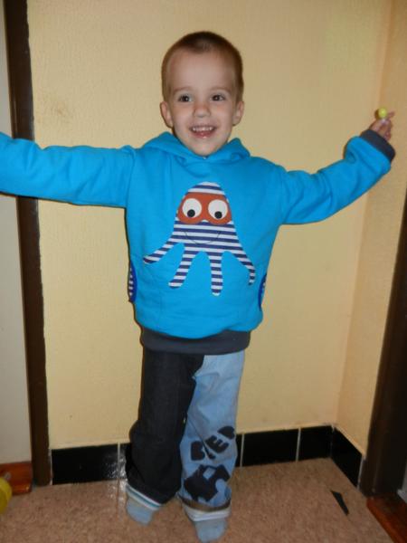 triko se slonikem (podle me a meho muze nejhezci triko co jsem ušila 😀 hihi),mikča (střih od paloška snad nebude vadit že jsem si půjčila z odkazu co tu proběhl 😅 tímto děkuji) s chobotnici (teplakovina od Def z postarame se -skvely material i barva) na mladsim synovi a pak starsim, starsi ma nas sobe i šité kalhoty (těma se moc nechlubím spletla jsem střih tak má každou nohavici jinou 😅 ale jsou super tpelý podšitý fineribem) a nakonec komplet pro kamarádčinu holčičku co jsme s mužem dělali (on odrážedlo já zbytek)...taštiška na dudlík,držák a taška na plenky pajc fram snad nebude vadit že jsem okopčila když je použito na soukromé účely 😅 tímto taky děkuji