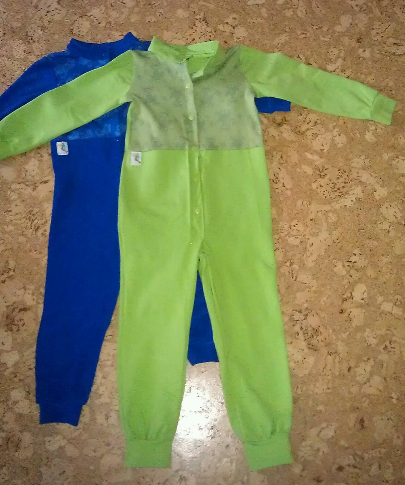 Ahoj dievcata, posielam par fotiek mojich vytvorov z poslednych tyzdnov. Kupila som na mylly bambusove frote - fakt skvely materialik a tak som spravila malemu pyzamo (modre), a pre velky uspech som usila aj vacsie, bavlnene s bambusovymi zabkami (zelene). Tieto overalkove pyzamka som v jeho velkosti uz v obchode nevidela, a on ich strasne rad nosi. A ja som rada, ze aj ked sa odkope netaha mu na krize. Strih som pouzila zlepeninu - kombinaciu teplakov s rovnymi nohavmi a bodycko, ktore som prisposobila na jeho rozmery. Nohavy su zamerne dlhsie - ked ohne nozku, aby mu nevybiehali nohavy hore nohou, preto maju aj manzetu na konci. Takto je stale vsade opyzamkovany nech spi v akejkolvek polohe.