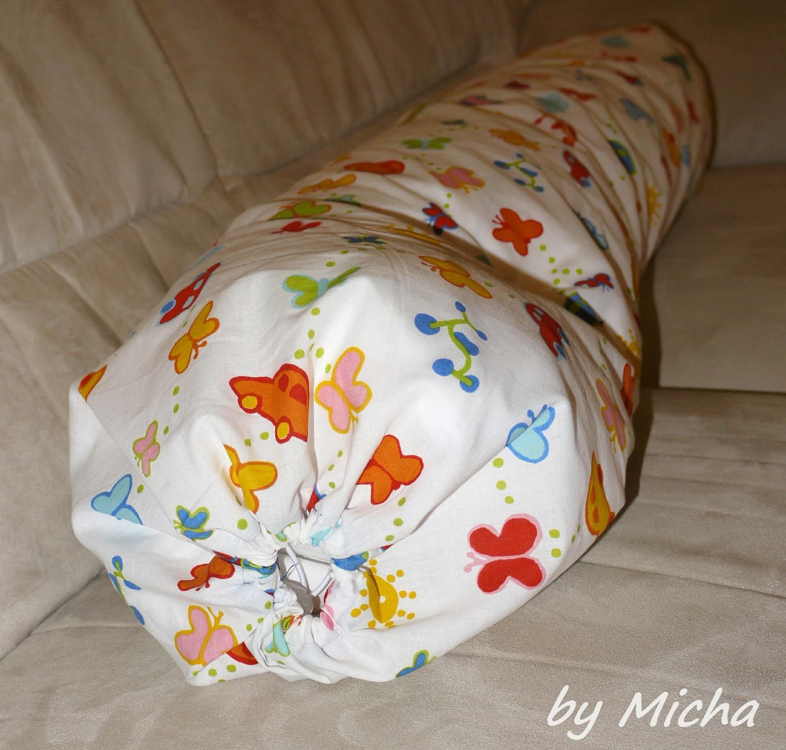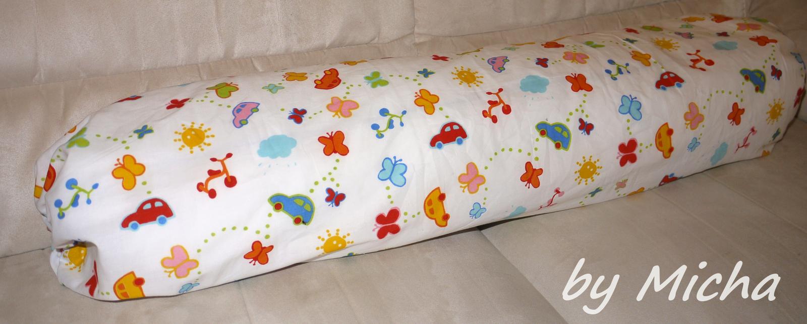 čau, já dneska dotvořila kojící polštář, prozatím bude sloužit jako těhotenský spací polštář 😀 původně jsem ho chtěla dělat s potahem na zip, pak takový ten potah bez zapínání, ale blbě jsem si ustřihla látku, tak je z toho jen takový válec, na koncích s tunýlkem a protáhla jsem tam kulatou gumičku s brzdičkou 😀 plnila jsem to kuličkama a docela v pohodě, nabírala jsem si je naběračkou a vysypala jich jen pár do vany, takže příště to budu dělat stejně 🙂 ještě mam rozešitou noční košili pro manžela, chybí mi tam dodělat ještě založení u rukávů, tak snad to zítra stihnu a pak dám i foto 🙂