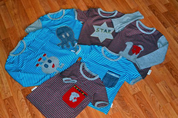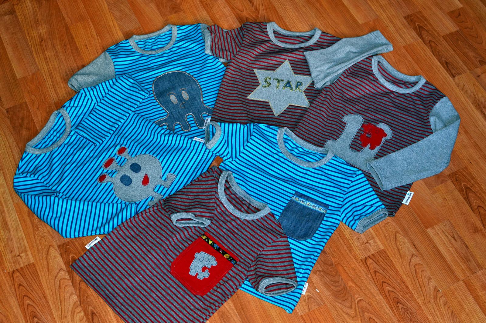Pridavam nejake foto Matejovych triciek. Usila som ich ovela viac, ale asi takto. Strihla som do tucniakov aj nejakych hrochov a robila som 110 velkost, ze ved ma 108 vysku, tak mu budu fajn. Uz pri oskusani prveho som od zufalstva az plakala. Tricko ako vrece. Akosi som zabudla brat do uvahy, ze moje dieta vyzera ako reklama na hladomor v Indii 😒 . No a moj synacik to vsetko zabil takym to vyhlasenim " mami a naco si mi urobila tolko pyzamovych vrskov???? A na moju nechapavy otazku, ze preco mi hovori : lebo su take ciste, ziadne vrecko ani nasivka!!!!Ved vravim, ze ako pyzama este ujdu. Takze tucniaky absolutne nezabodovali, tak som upravila strih a dala sa do nasivkovych, nech nevyzera ako v pyzame. Podarilo sa mi to za vda dni a teraz idem pauzovat, hadam aspon chvilku ma kazdy vsetko. Zvysok sitych handriciek som ani nefotila, lebo som nestihla a boli v obehu. Sila som termopradlove gate pre Samka z bambusu ( zase ich nechce ani vyzliect ) nejake leginy pre Juli a latkove hracky a oblecko pre ne pre Nellie.