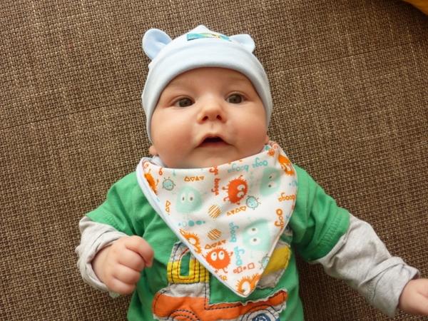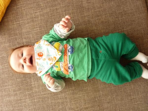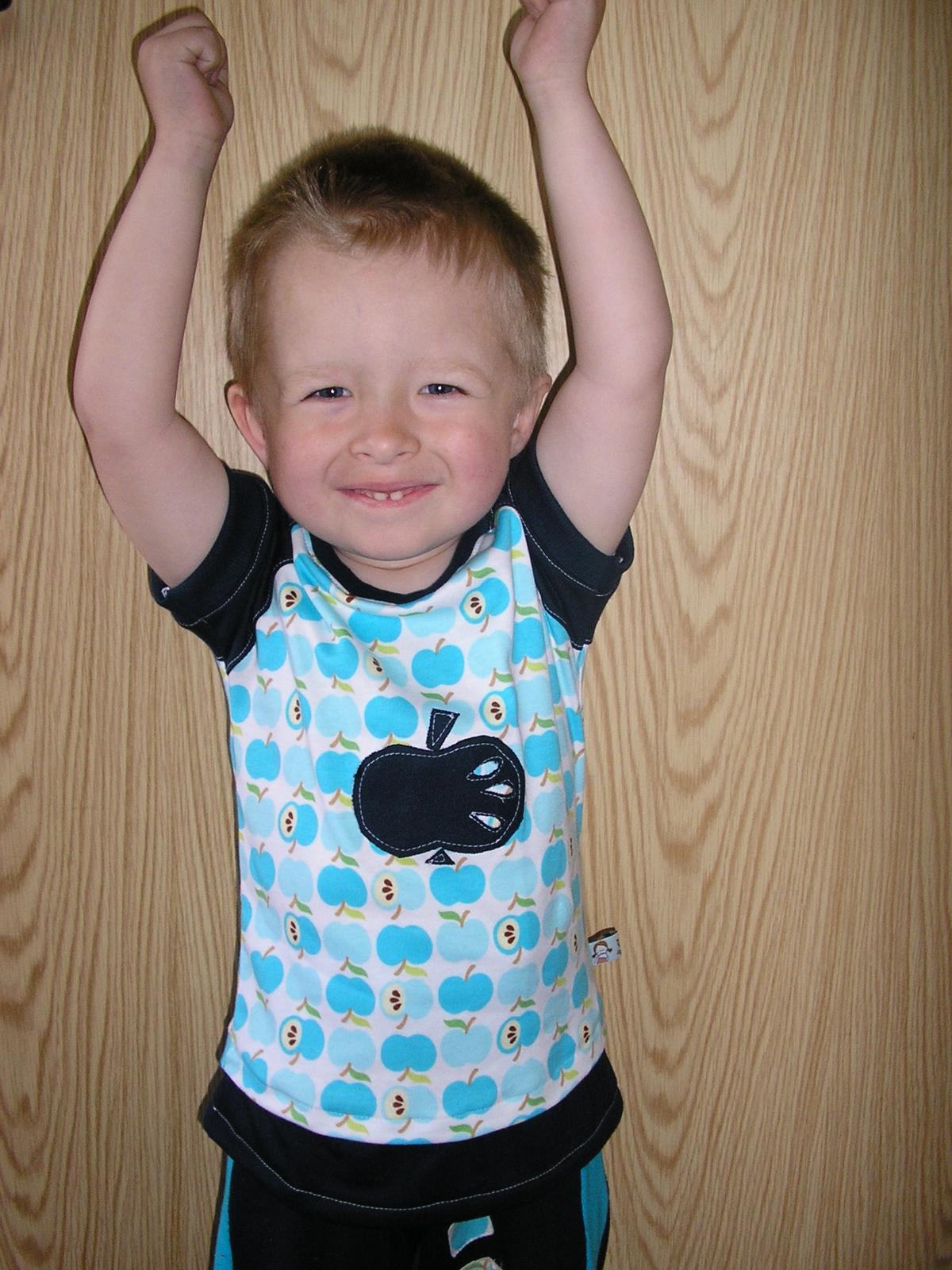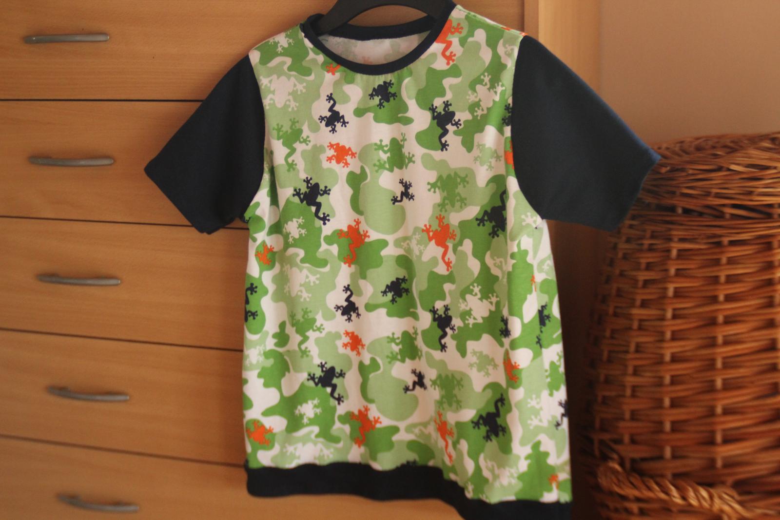 Ještě jsem nejstaršímu šila tričko, jenže se moc nepovedlo. Jednak jsem ho nastřihla moc široké a pak se mi ještě zvlnil ten spodní lem, takže jsem z výsledku zklamaná. Příště to musí být lepší 🙂