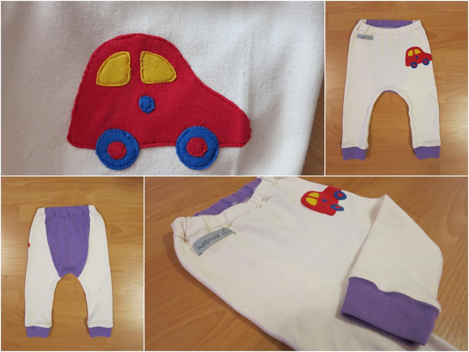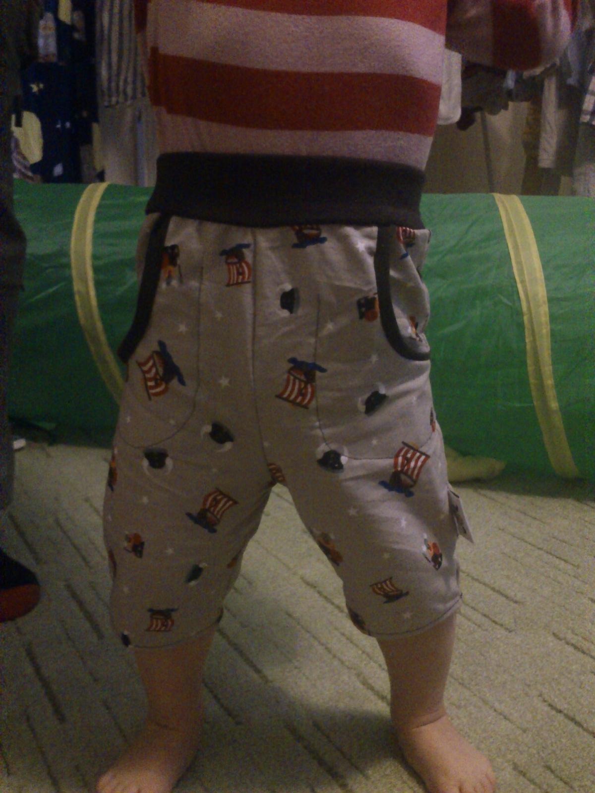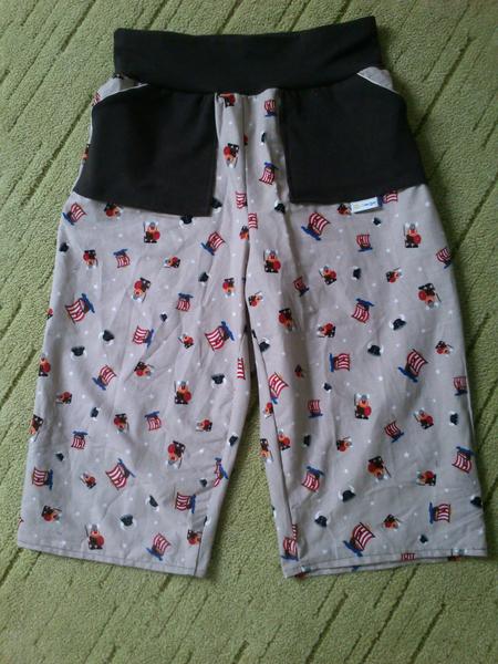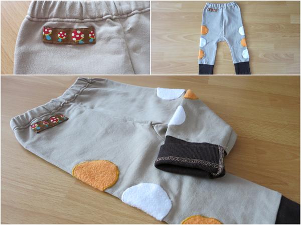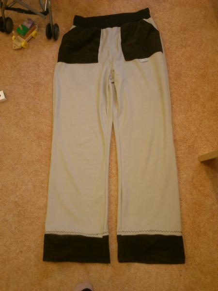 dlouhé kalhoty z šedobéžového piké pro mě, kapsy a konce nohavic jsou z hnědého pracího kordu, vyfotit to neumím, je to nějaký moc velký 😀 (tady by modelka sice neodběhla, ale zase se děsně nerada fotí 😝 ).