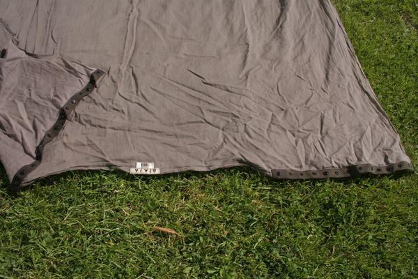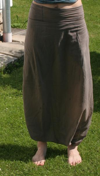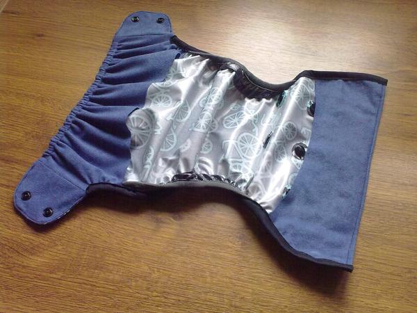 na jedné úzké straně obdélníku jsou patentky, ty se zapnou kolem těla vepředu, celá látka se protáhne mezi nohama a ta strana s kalounama se zaváže vzadu.