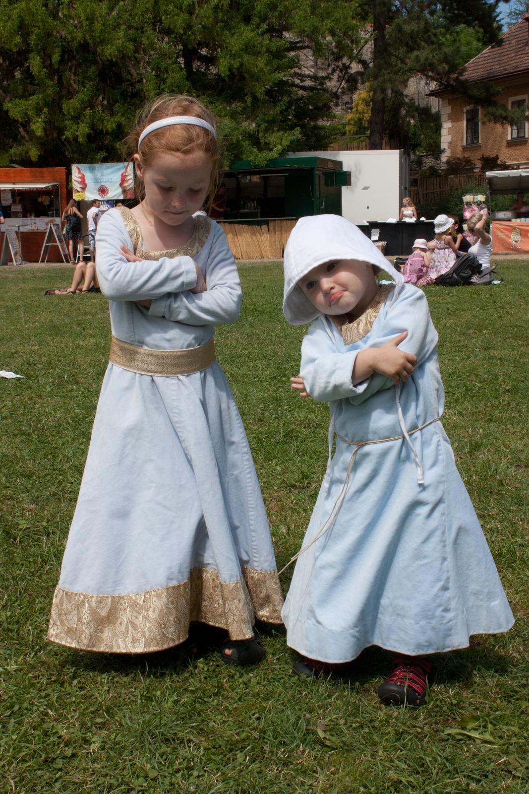 Nějak vás tu vůbec nestíhám. Zběžně nahlížím, vidím, že tvoříte, šijete.. To je paráda, já na stroj sáhla jen teď v posledních pár dnech a to jen proto, aby dokončila kostýmy na kutnohorské Stříbření (ještě jednou zdravím @veronik77 🙂 a přihazuji fotku kostýmů našich holek. Svrchní šat z bavlněného sametu doplněný brokátem, spodní košilky ze lnu (bohužel nejsou vidět, tak si je budete muset domyslet). 😀