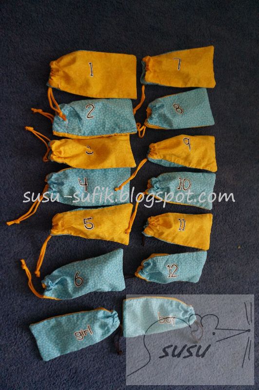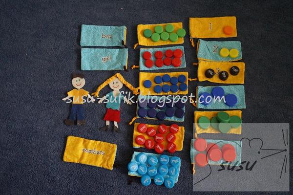 Počítací hra - pytlíčky s čísly a uvnitř různý počet barevných víček a ještě pytlíček s klukem a holkou...