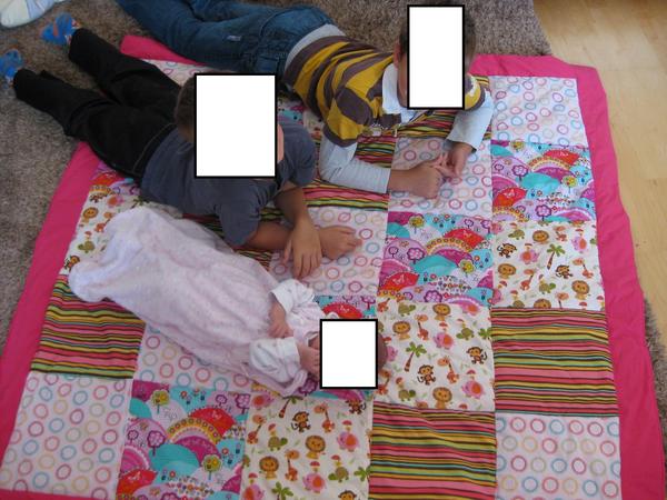K fotečkám - první dečka patchwork je slabá letní a ušitá z malých bodýček (takže i takové symbolické, na památku)
