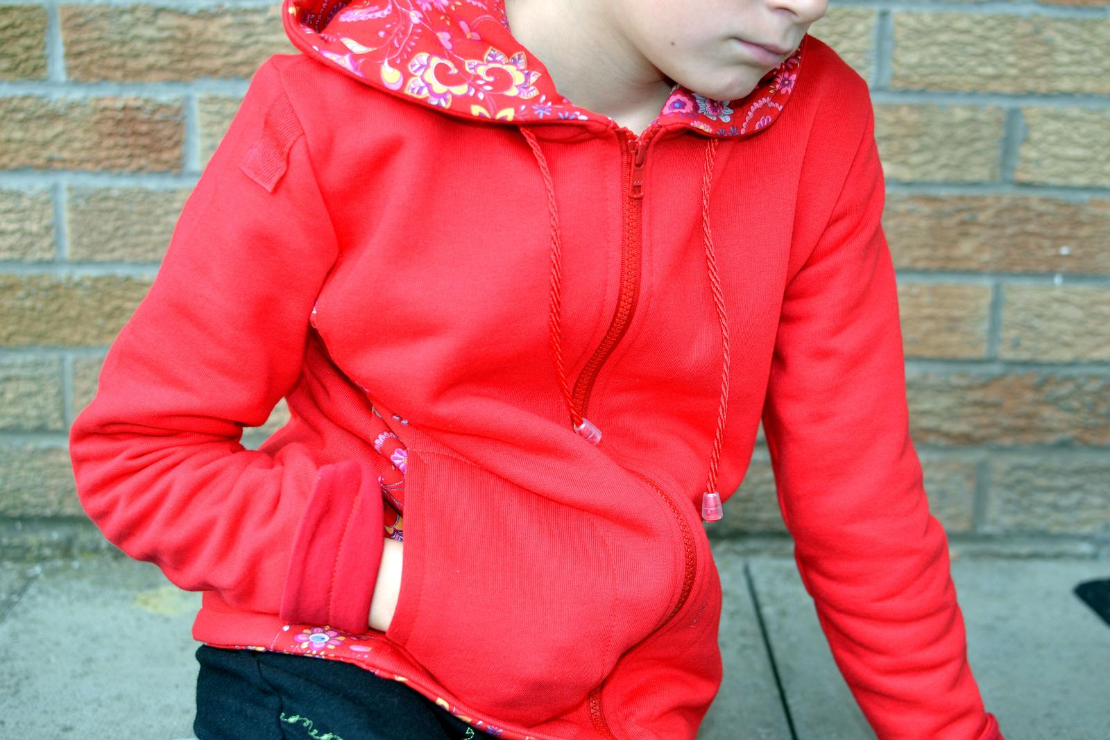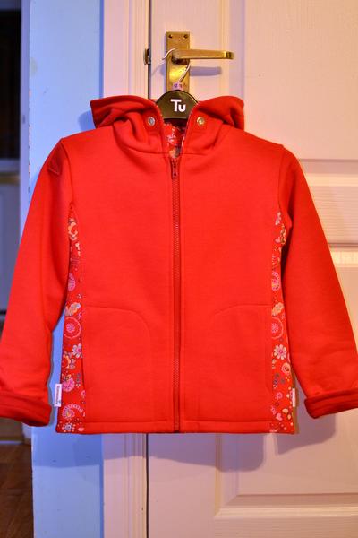 Červená obojstranná len zo zvyškov na odskúšanie strihu, kedže Juli má asi 5 rozdielnu velkost - v páse 104 a vyska 140 😀 😀 😀