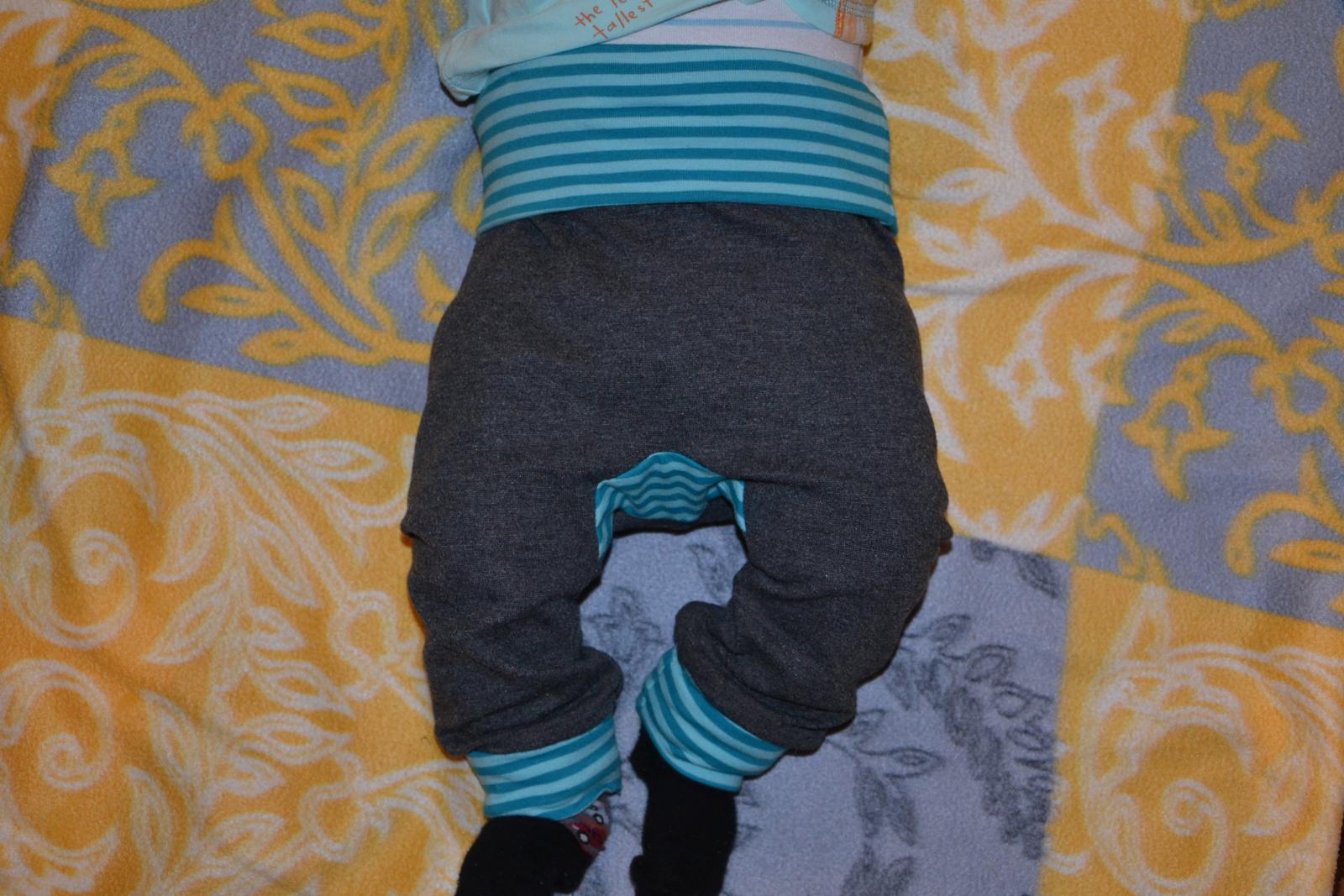 moje včerejší akce. Kamašky pro staršího z fineribu. A ze stejného pro mladšího tepláčky... chtěla jsem je udělat malinko větší a trošku jsem to přehnala 😀 obleče je i starší, akorát mu to plandá, jak nemá plínku 😀 😀 , ale když jsem ohrnula lemy, tak to jde (viz. foto na mimču 😉 ). takže jestli vydrží matroš a moje šití, tak budou tepláčky asi na dlouho 😉 😉