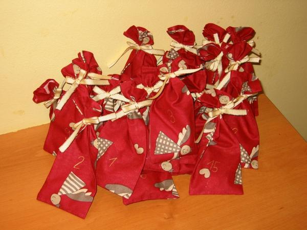@jemi Andrej měl už ve 4 m, ale jen proto, že ho měly i jeho sestry 😀 , šila jsem tehdy 3*24 pytlíčků 😀 😀 😀 . Foto jsem už sem dávala, ale dám ještě jednou 😀, tak snad to nikomu nebude vadit . Loni už rád vytahoval, sice nechápal, ale radost měl. A dávala jsem tam zdravé bonbony z DM - pytlík jsem měla na několik dní, ale i nezdravé věci nebo třeba ozdoby na stromeček, klidně můžeš upéct perníčky