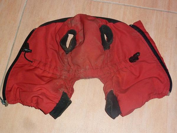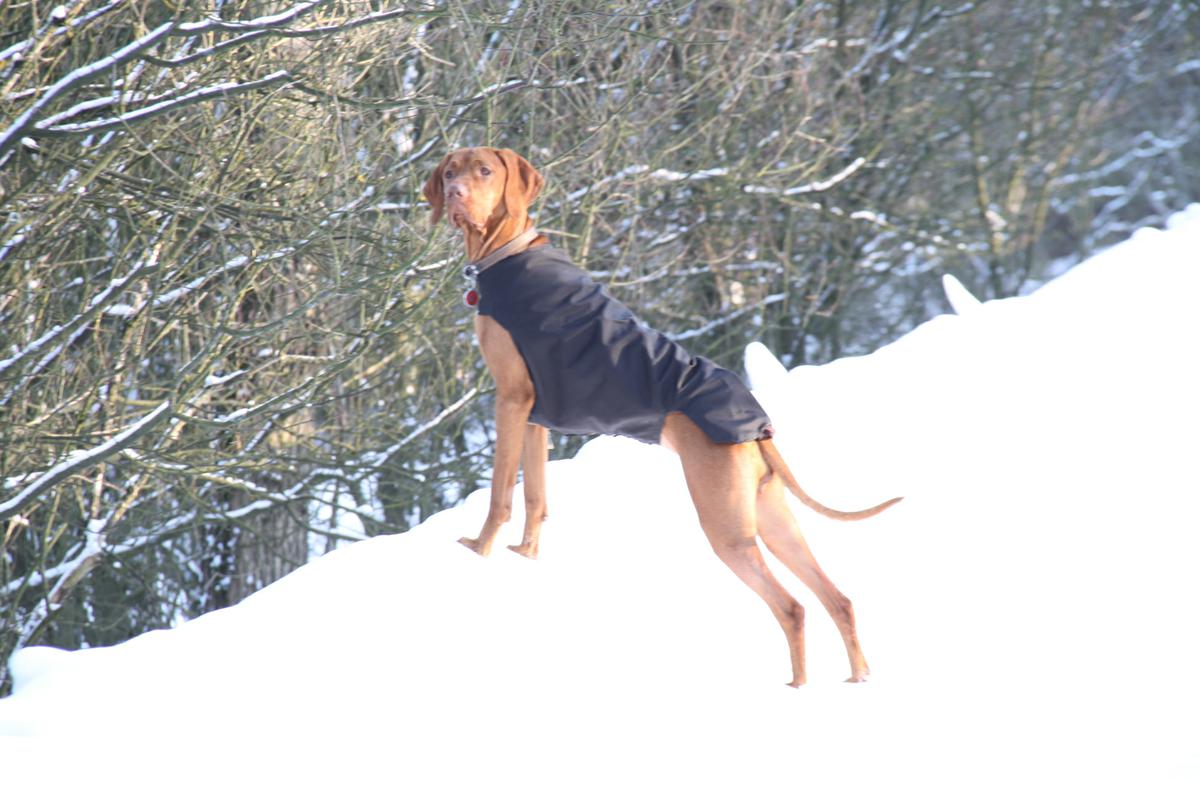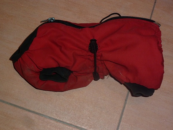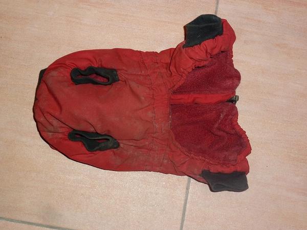 @bordino snad to nikoho neurazí - obleček je kupovaný - nešila jsem ho.Ale jen tak pro představu. Je na Jorkšíra a má krytý hrudníček a právě na břiše je možné ho stáhnout gumičkou aby dobře seděl, nefoukalo tam, nenabíral sníh a pejsek si do něj nečůral. Je špinavý - právě jsme se vrátili z procházky. 😉 Nahoře je zip a jsou tam vidět ty brzdičky na gumičce.