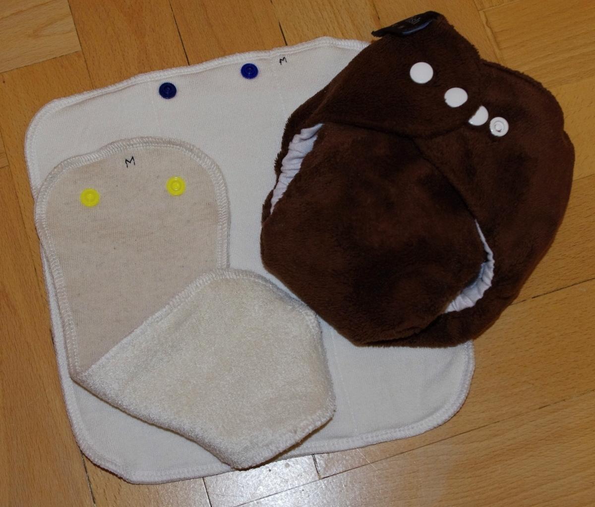 Mám asi 14 dnů doma kleště na patentky a měla jsem velkou radost, že patentky pasují i k těm, které jsou nacvakané na plenkách Itti Bitti, takže jsem si ušila náhradní vkládačky. Tyto plenky vypadají krásně a prckovi dobře sedí, občas do nich dávám i čtvercovky na novosklad, ale přece jen ty jejich vkládačky jsou např. pro tatínka pohodlnější (fakt jsem se nesnažila ho naučit skládat novosklad, jinak by asi odmítl přebalovat). A moje první svrchní kalhotky podle osvědčených Bambinomio. Sedí dobře, takže se můžu směle pustit i do dalších už z hezčích vzorovaných PULů.