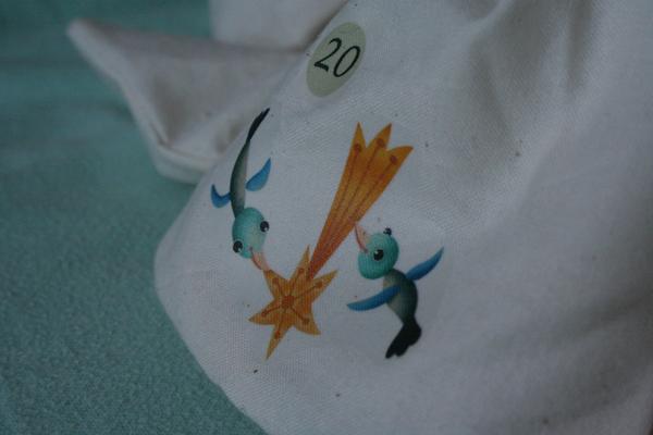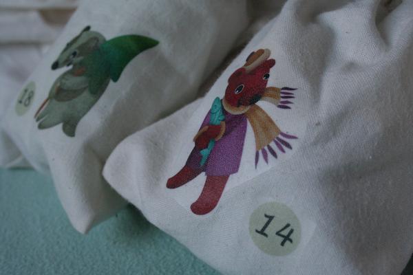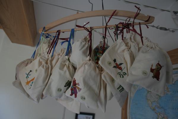 Kalendář máme pytlíčkovej, na ramínku visící. S navěšením jsem si letos moc nehrála, tak konečný efekt nic moc. Nicméně obrázky od Amélky jsou nádherný. Příští rok si je líp naaranžuju 🙂